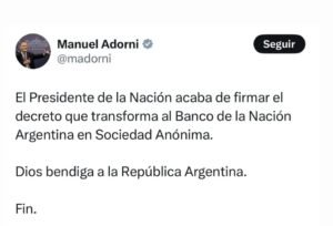 El presidente Javier Milei decidió transformar el Banco de la Nación Argentina en una sociedad anónima mediante el Decreto 116/2025, sin debate parlamentario ni consulta pública. El anuncio lo hizo su vocero, Manuel Adorni, en un escueto mensaje en redes sociales: «Dios bendiga a la República Argentina. Fin.»