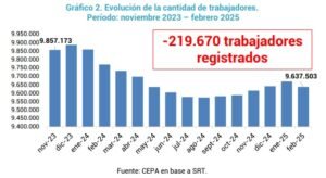 Por otro lado, en el mismo período mencionado se redujo 2,23% la cantidad de trabajadores registrados en unidades productivas, con una pérdida de 219.670 puestos: de 9.857.173 a 9.669.342.