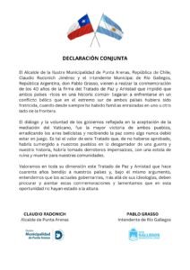 El intendente de Río Gallegos, Pablo Grasso (por Argentina) y el Alcalde de Punta Arenas, Claudio Radonich (por Chile), firmaron una Declaración conjunta en donde pusieron en valor la importancia del Tratado de Paz y Amistad firmado entre ambos países hace 40 años, en el marco de un conflicto que pudo llevar a ambas naciones a la guerra, de no haber intermediado Su Santidad el Papa Juan Pablo II.