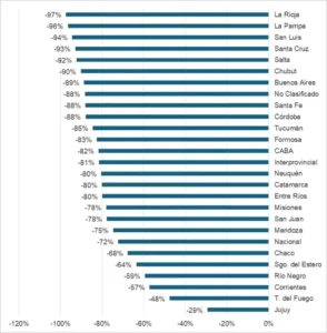 Con respecto a las provincias más afectadas, el informe señala que tanto La Rioja ($1.352 millones en 2024) como San Luis ($996 millones) fueron la de mayor contracción en términos reales: 97% para la primera y 94% para la segunda. En la Patagonia, Chubut Santa Cruz también tuvieron caídas pronunciadas en la inversión real, que alcanzaron el 90% y el 93%. Los distritos del centro del país no fueron una excepción: ciudad de Buenos Aires tuvo un 82% menos de gasto en obra pública, mientras que en la provincia de Buenos Aires ese índice llegó al 89%.