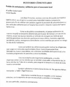 🔻 Fuente: Petitorio comunitario presentado al gobernador Claudio Vidal por trabajadores y vecinos de Puerto Santa Cruz.